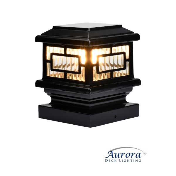 Aurora Deck Lighting Orion LED Post Cap Lights add a geometric design in front of the ribbed glass panel for a little more style. Orion LED Post Cap Lights utilize a state of the art LED panel that runs on AC or DC transformers. Made of heavy duty cast aluminum with a premium powder coat finish. Available in colors to complement any deck rail. Post sizes 3-1/2" to 5". Order Orion Post Cap Lights to fit the exact size of your post.