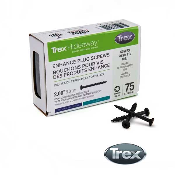 Trex Hideaway Enhance Decking Plug Screws are specifically for Enhance Deck Plugs. 2" length for scalloped Enhance boards, with a larger head for holding power so they will work with Enhance Deck or Fascia Boards. Available in 75CT Boxes & 400CT Buckets. Install Enhance Decking with the Enhance Deck Plug Tool Kit, & use the Hideaway Fascia Plug Tool Kit for fascia boards. These deck plug screws are for Enhance decking only, for Transcend, Lineage, & Select decking use the Trex Hideaway Deck Plug Screws.